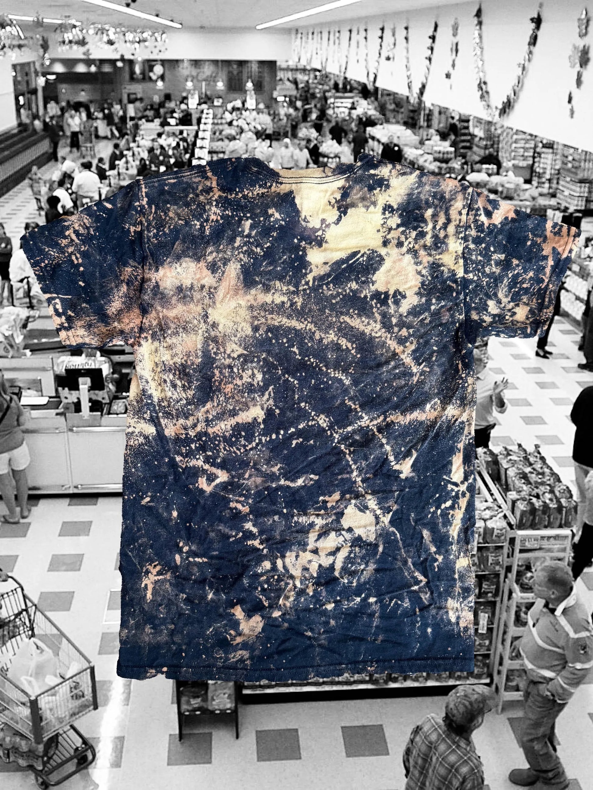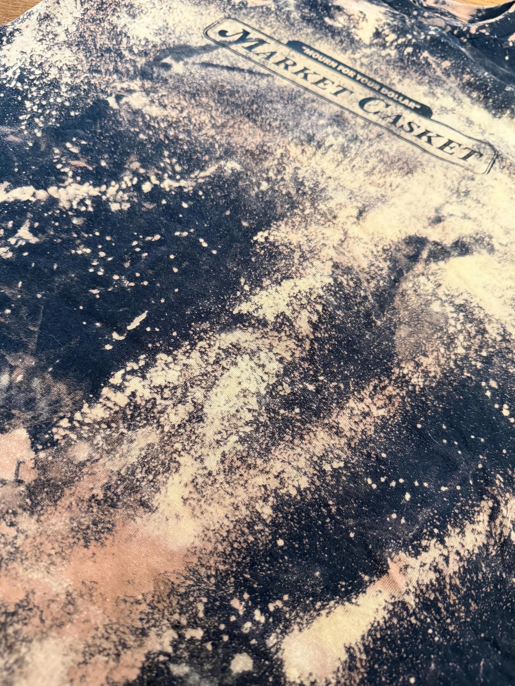 Market Casket Mourn for your dollar screen printed in black on bleach dyed Gilden t-shirt.